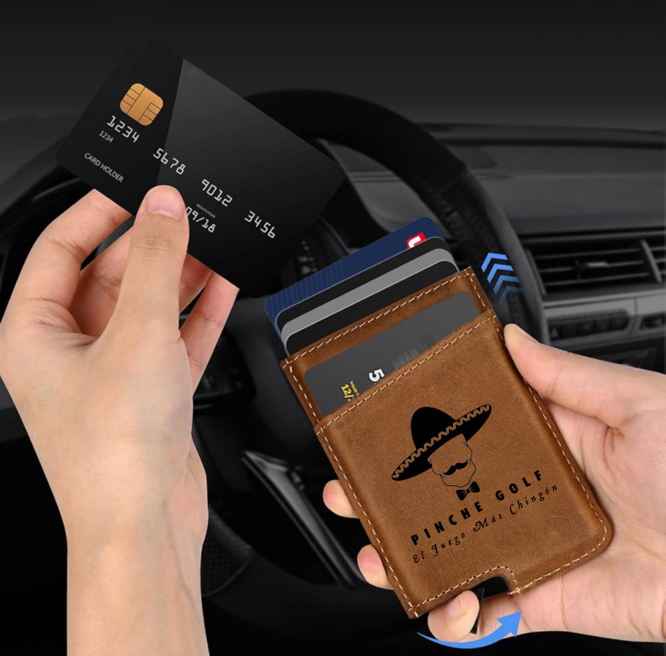 This minimalist, slim and refined wallet is designed to keep your cards safe and accessible. The wallet's inner case has RFID blocking technology, while the outer shell is wrapped in genuine leather. The wallet has a trigger mechanism that allows a simple way to pop up and access up to six cards easily. Finished with a laser engraving of the Pinche Golf logo and slogan, this leather wallet is functional, durable and